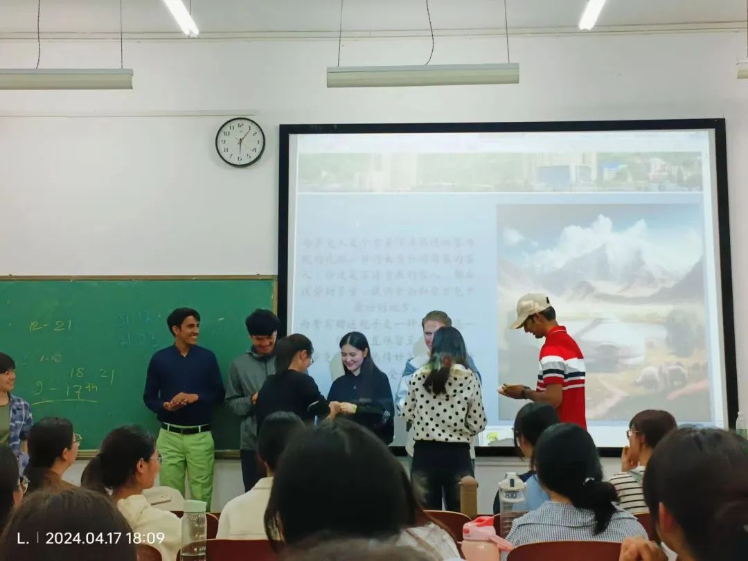 全体成员合影留念,定格美好瞬间;中国学生向留学生赠送手工礼物,传递文化情谊。