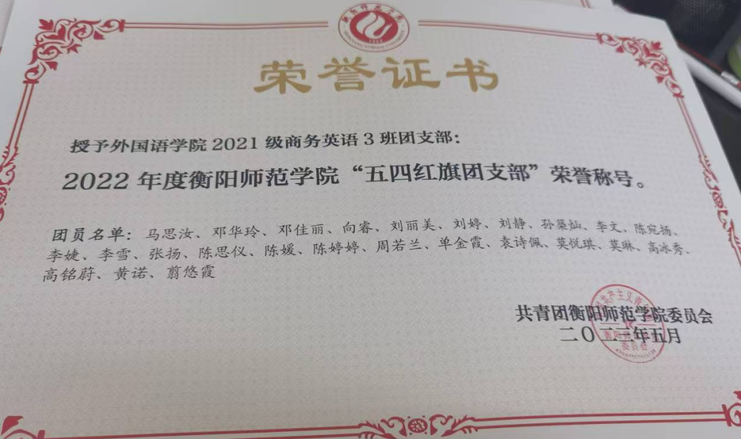 当然,班级的荣耀不仅体现在个人的成就上。2021级商务英语三班先后荣获优秀班集体和五四红旗团支部等荣誉称号。这些集体荣誉,是对班级凝聚力与向心力的肯定,更是激励着每一位同学奋勇向前的强大动力。带着这份荣誉与骄傲,同学们向着更高的目标不断迈进,在未来的道路上,相信他们定能续写更多辉煌篇章,创造属于自己与班级的精彩!