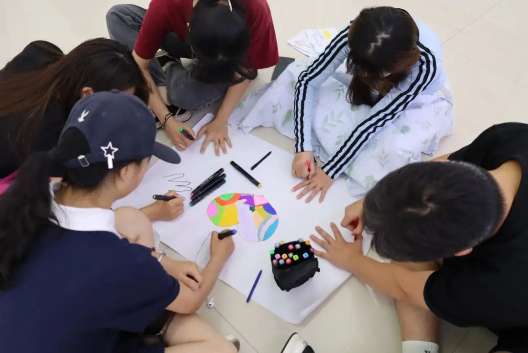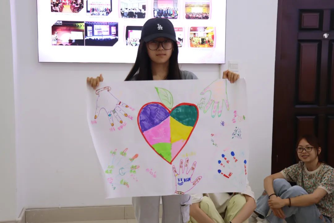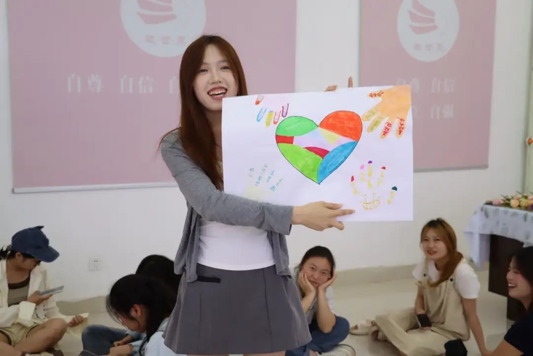 在情绪表达环节,各小组围绕“情绪可视化”主题进行绘画创作。同学们用不同色彩填充爱心,直观展现当下的情绪状态;同时在手掌轮廓图上认真书写自身的5个优点,实现了内心情绪的具象化表达。作品展示过程中,色彩明快的画作传递出乐观积极的心态,而细腻柔和的笔触则生动展现出内向学生丰富的内心世界,充分凸显了艺术疗愈在心理疏导中的独特价值。