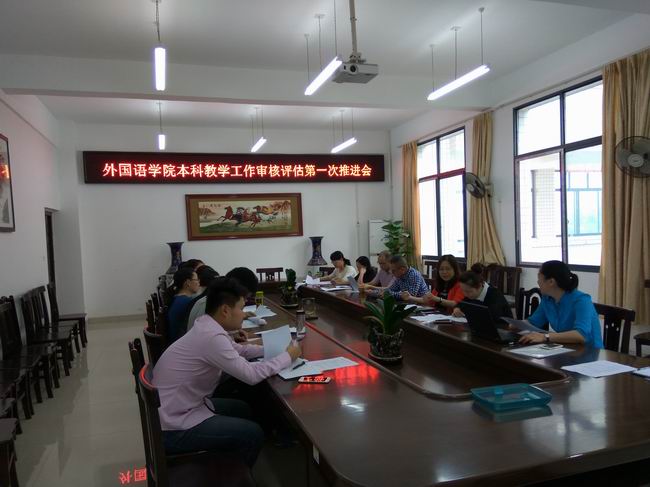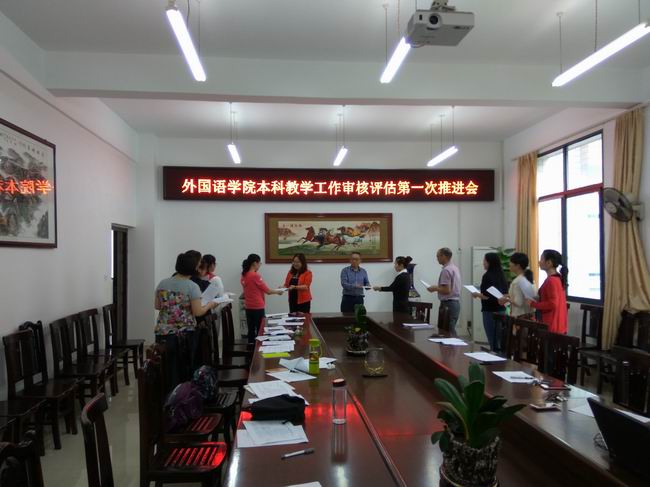 5月15日下午,外国语学院本科教学工作审核评估第一次推进会在外语楼南213会议室召开。外国语学院党政领导班子,各系主任,教学秘书,学生辅导员等相关工作人员参加了此次会议。会上,贺学耘院长强调了评估工作的重要性,指出评估工作是义不容辞的责任,必须全员全方位参与;郭友文书记要求大家要一切围绕评估,一切服务于评估,要按期高质量地完成下发的任务;贺鸿莉副院长宣读了《外国语学院本科教学工作审核评估范围及任务分解表》,组织大家认真学习评估方案和指标体系,要求准确把握评估指标体系及各指标的内涵与要求;认真对照任务分解表,全面充分地明确所承担的评建任务。